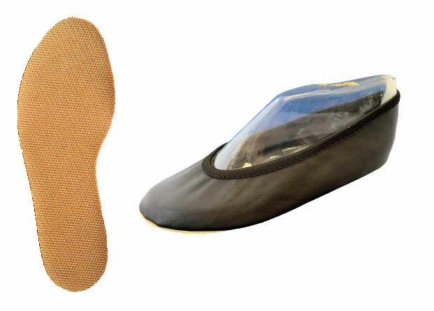 Gymnastikschuh aus Leder mit Rundzuggummi, mit rutschfester Gummisohle.