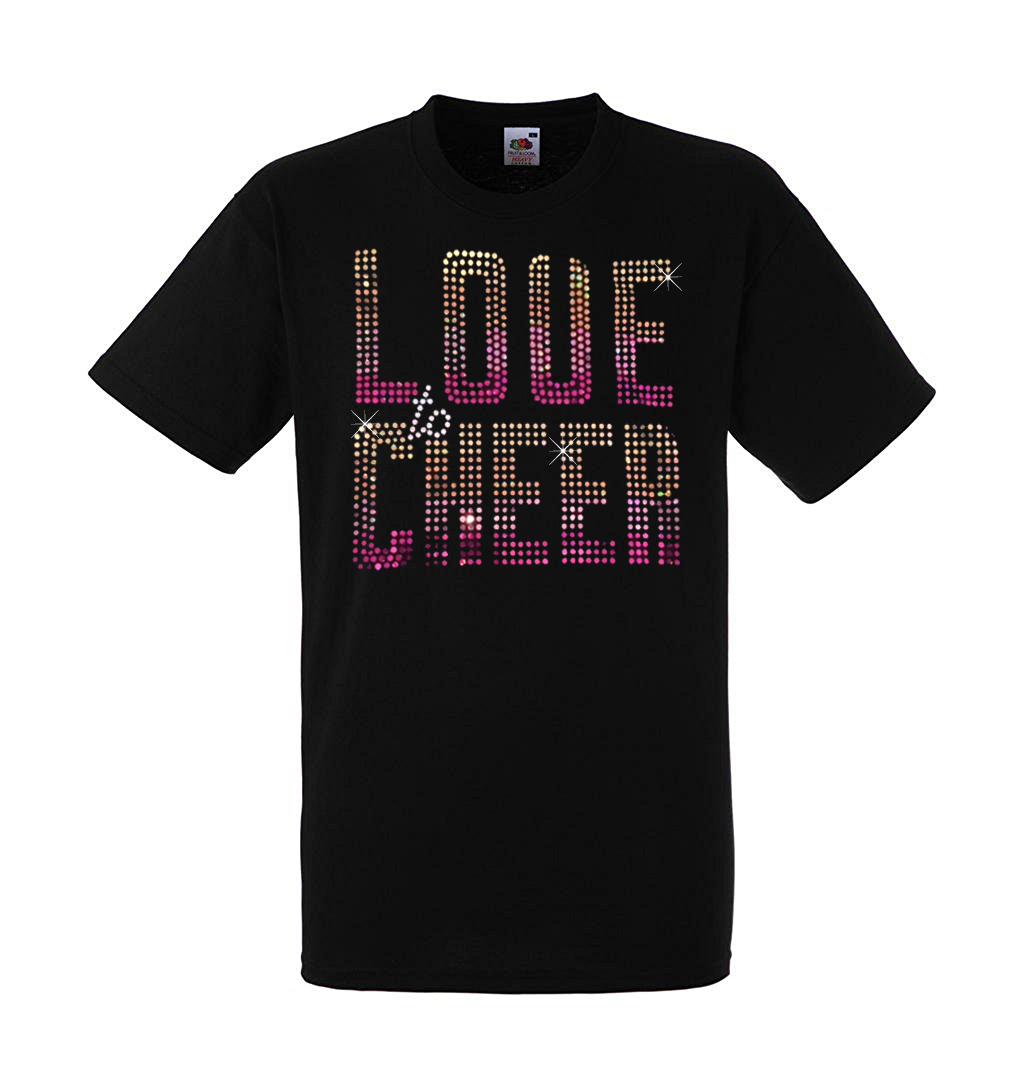 Hochwertiges FOL T-Shirt mit riesigem bunt verlaufenden Holo-Pailettendruck "LOVE TO CHEER" auf Brusthöhe.